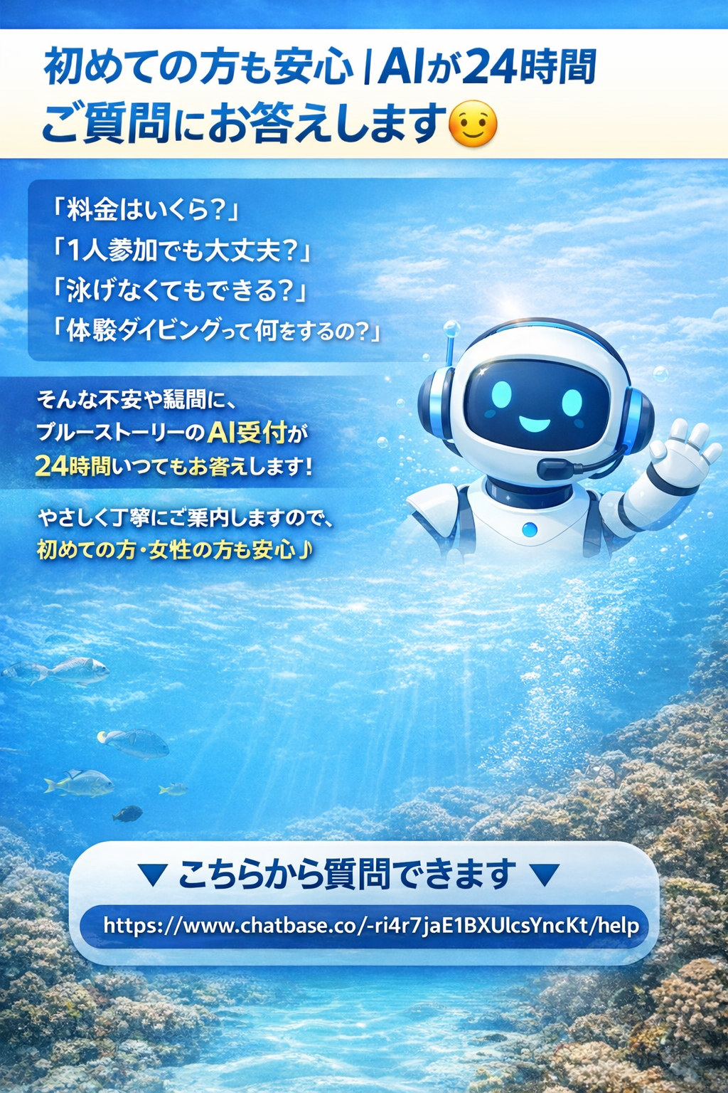 経験豊富なインストラクターが基礎から丁寧にレクチャー。初心者や女性1人の参加でも、不安なくダイビングを始められます!安全管理を徹底し、ライセンス取得後も安心して潜れるスキルをしっかり習得。不安を解消するため、親身にサポートします!